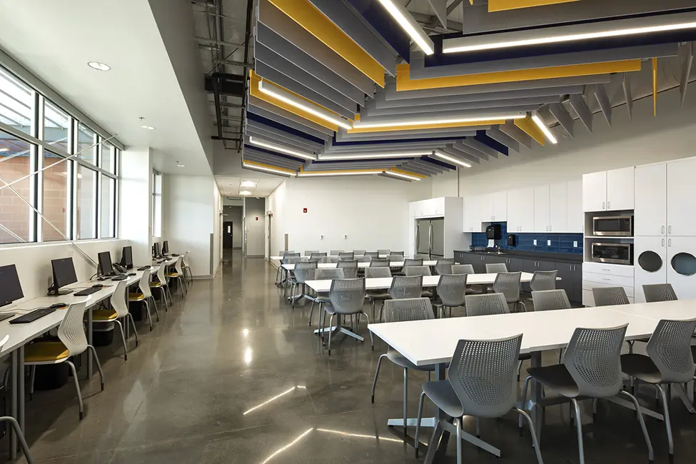 The new facility houses multiple Public Works departments and provides site exterior space for parking and storage of city vehicles and equipment. The fleet maintenance department, which repairs all city vehicles including large vehicles such as sanitation and fire department trucks, is located in the building. Vehicles enter the maintenance bays inside the building which includes a parts warehouse, providing conditioned space for the maintenance staff. The rest of the building houses administrative offices for Streets, Signs, and Solid Waste departments, which previously were located at separate sites. These departments share conference spaces and break areas that are centrally situated. The shared spaces provide both better amenities for each department and savings for the city. WSM worked closely with the city staff to understand the goals and priorities of these different departments in order to provide the best value for the city’s limited budget.
