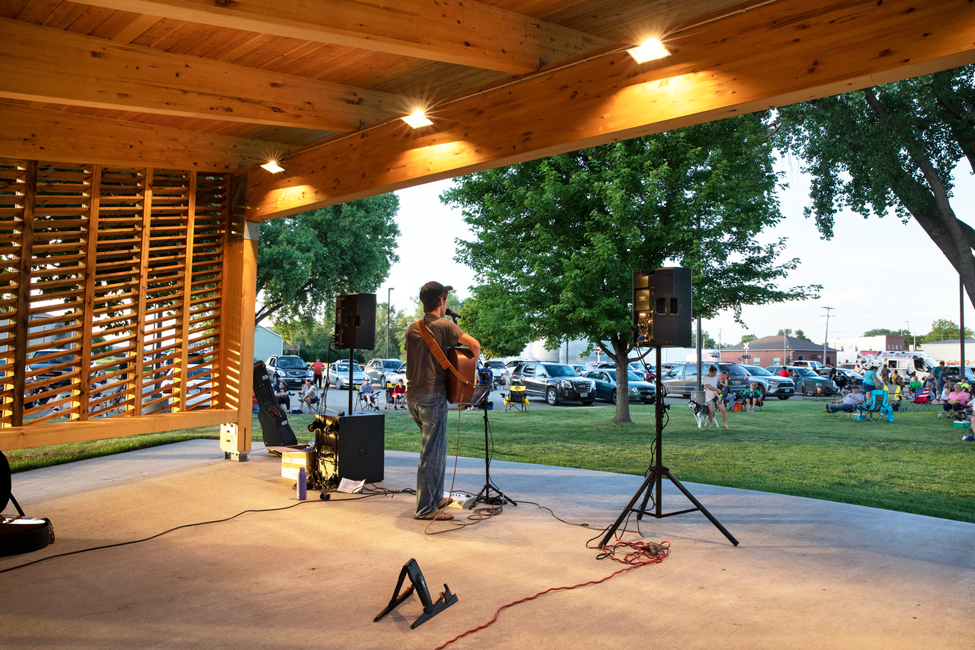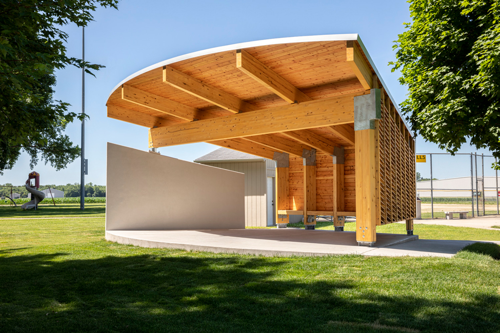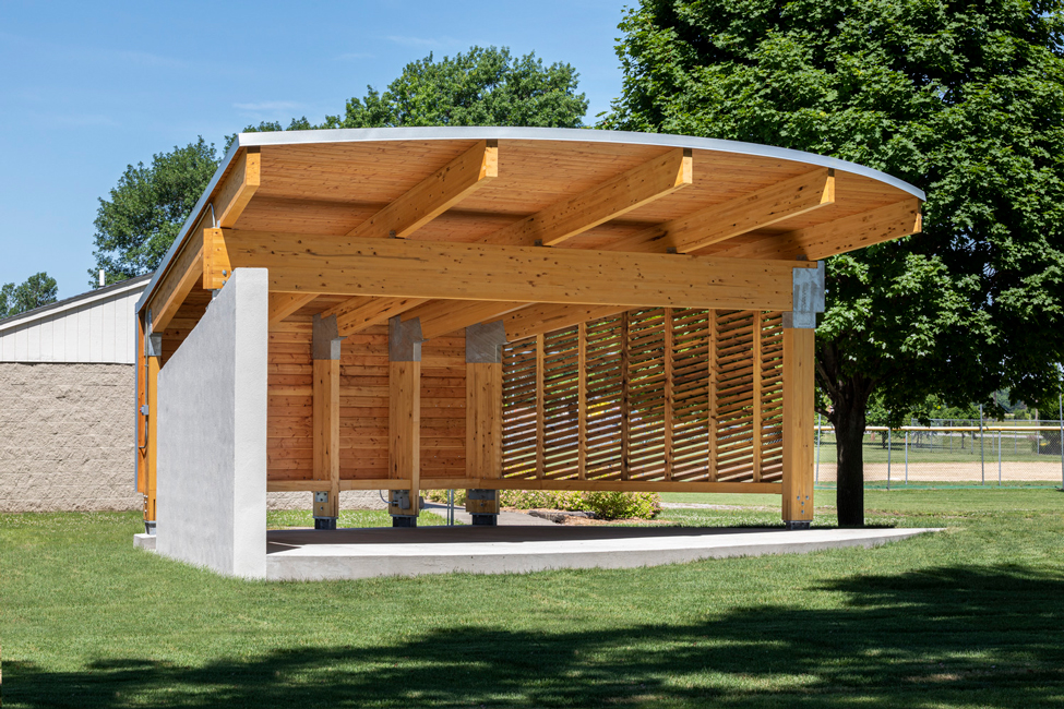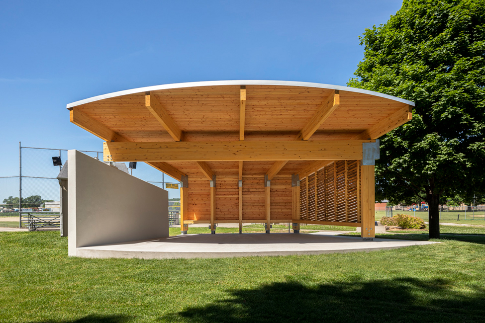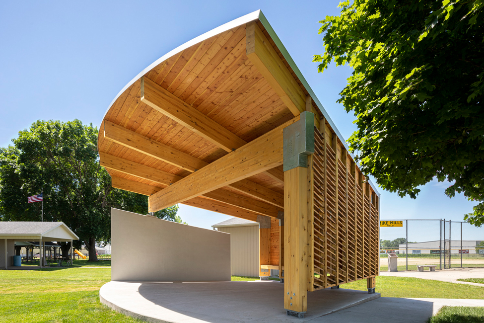 The Hills Bandshell was conceived as nestling forms of timber, metal and concrete, each material performing roles suited to its nature in service to the program. Douglas fir decking forms a warm, resonant acoustical chamber. Durable Alaskan yellow cedar timbers splay across the flattened conic section of the roof, their geometry adjusting subtly to varied angles of intersection while maintaining legible expression and structural efficiency. The concrete platform and wall provide durable performance and projection surfaces for live music and video presentations. Galvalume roofing protects both timber and occupants from weather, echoing the simple forms and materials of nearby farm buildings.