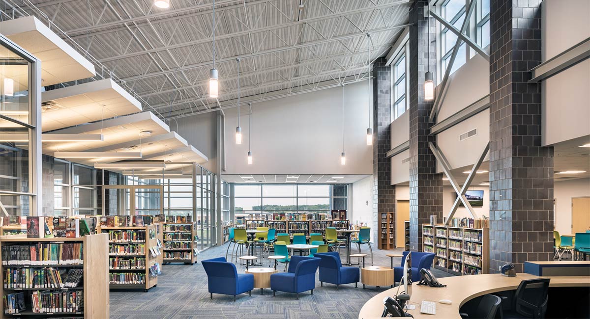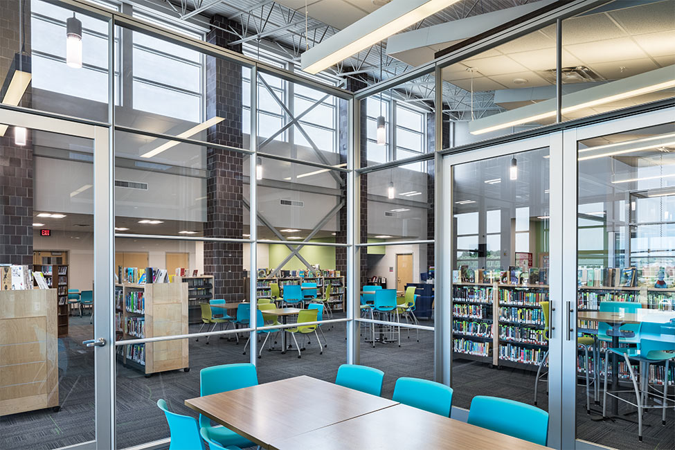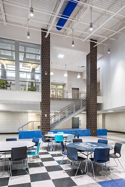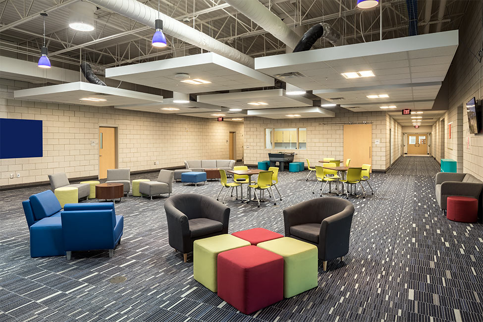 The main office was relocated to the addition to provide visibility to the main campus core and create a secure entrance. A new bus drop off was added to improve the safety of students. Adjacent to a large commons space and entrance area a large canopy provides shelter for students as they gather before school and between extra-curricular activities.