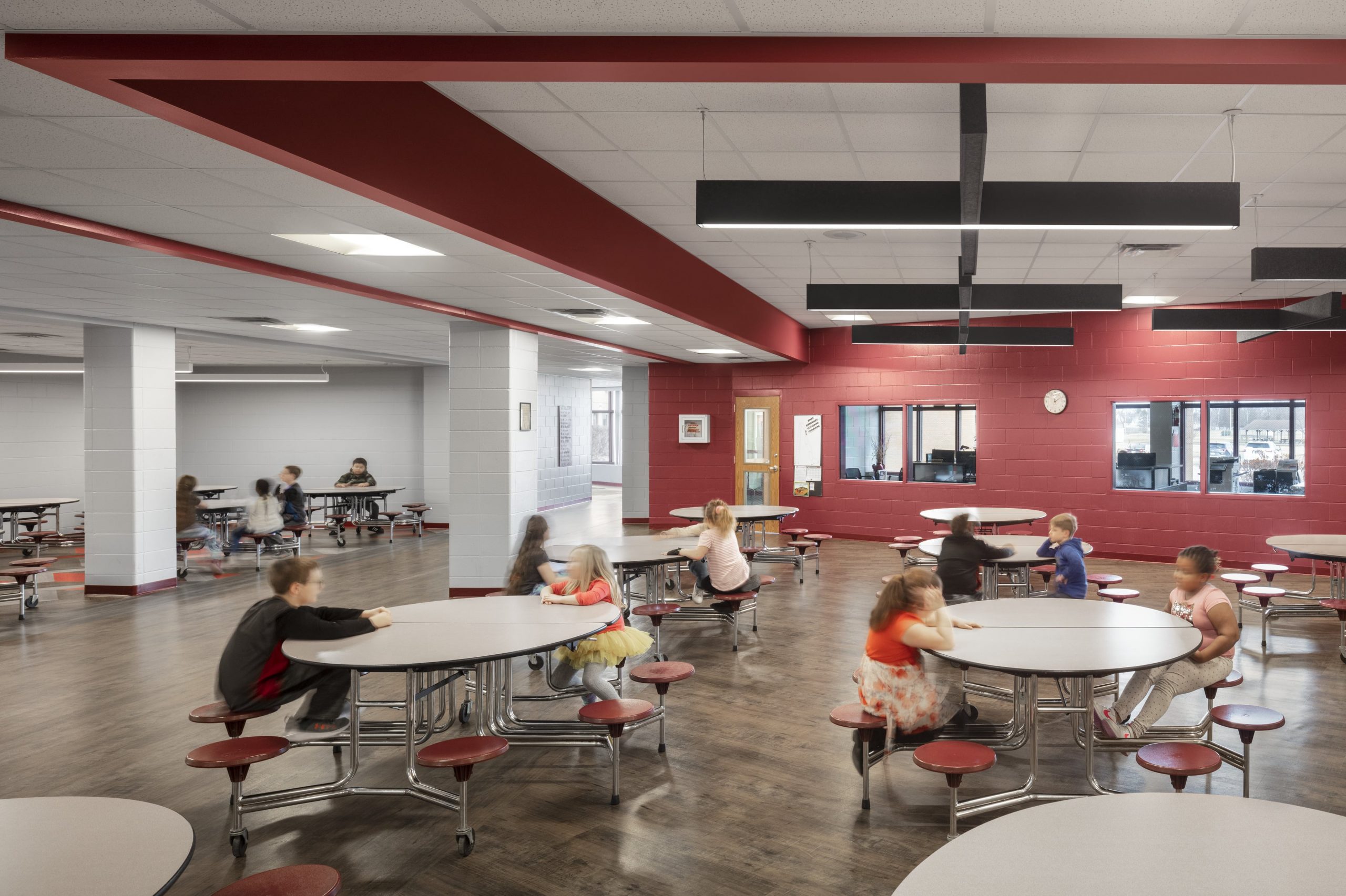 Beige block walls and peeling up flooring in the entrance and cafeteria areas were replaced with more vibrant finishes. The school’s colors of red, black and white were used in both the new LVT flooring and on the walls to add color and visual interest.