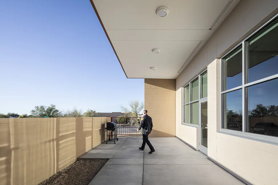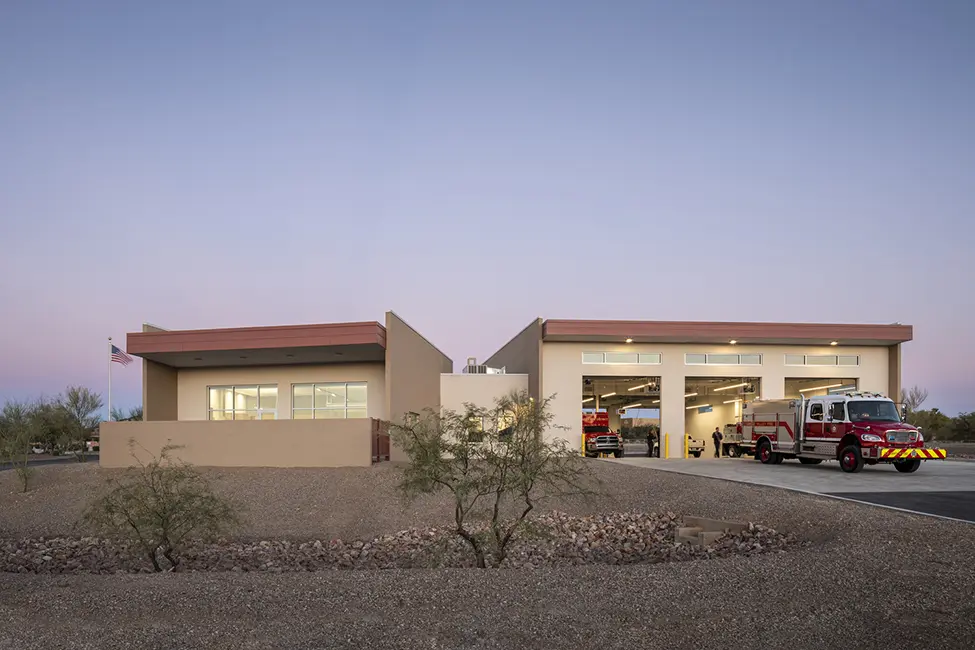 The new Station 152 is equipped with 3-drive-thru bays with a decontamination alcove, seven bunk rooms, three non-gendered shower rooms, cooking and eating spaces, dayroom, offices, and a turnout room. Special features of this fire station: living areas (dayroom and kitchen) are angled to take in the views of the Santa Rita Mountain range. All mechanical equipment is roof mounted and hidden behind a mechanical screen wall. The station design concept was taken from the residential home design across the street featuring large vertical masonry walls with a single pitched sloped roof. Shive-Hattery was very cognizant of the local architectural style of the community of Green Valley.