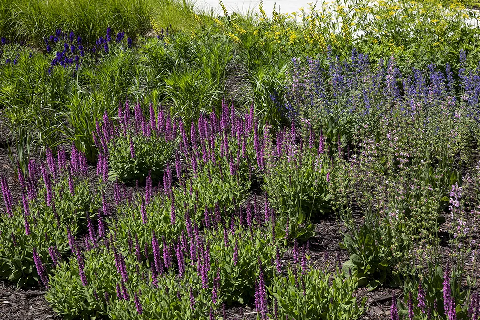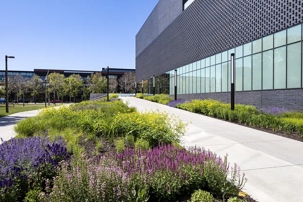 The main planting feature is a dynamic perennial bed along the slope in front of the building. The design of this bed is inspired by impressionist paintings with a tapestry of colors and texture that change throughout the year.