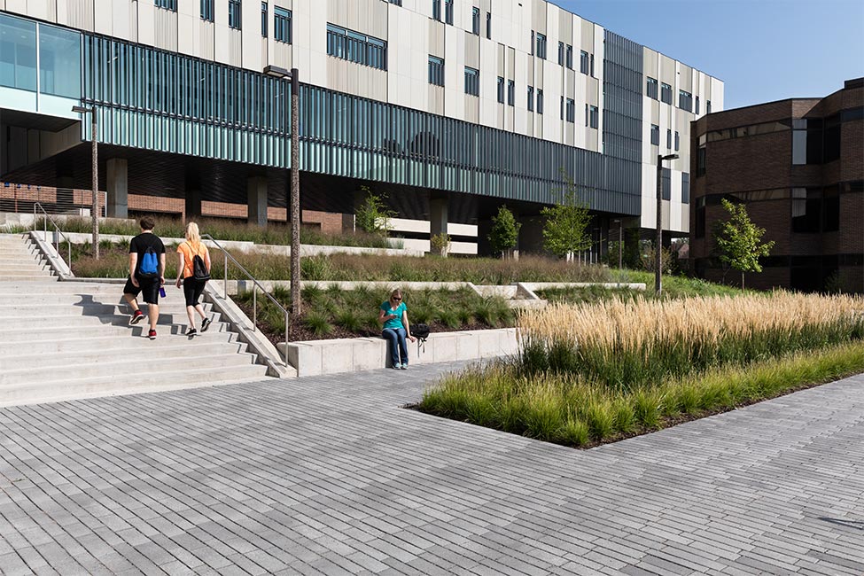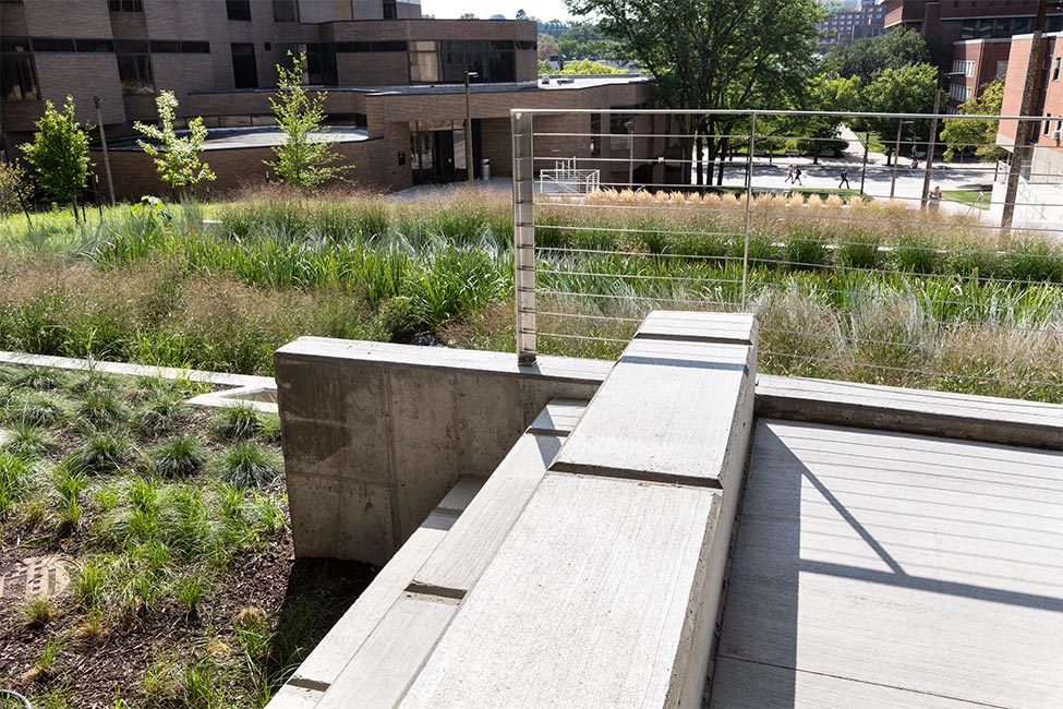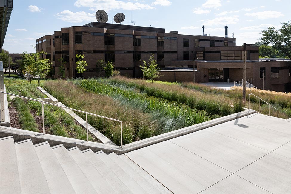 A vegetated tray system on Seamans Center’s roof helps capture rainwater and acts as an insulator for the building. Permeable pavers define flat plaza areas and help reduce impervious surface runoff. Storm water captured by the pavers also helps add moisture to the adjacent planting areas. Concrete weirs and retaining walls control ponded stormwater in a series of biocells while drought-tolerant, deep-rooted native plant species – such as Switch grass, Little bluestem and Prairie dropseed – filter pollutants and infiltrate water to underground detention chambers. These chambers are filled with soils and rocks that help filter out the water slowly. An easily accessible water monitoring system in the biocells allows researchers at the college to track storm water quantity and quality and to use the system as a teaching tool.