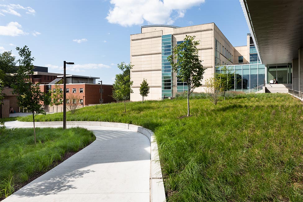 A 65,000-square-foot addition to Seamans Center, the University of Iowa’s engineering building, sits on a steep hillside near the Iowa River. Therefore, one of the major goals for the project early on was to create a comprehensive system throughout the site that would reduce runoff by capturing and treating storm water. The landscape design team used nature’s tools to create a pedestrian corridor outside of the addition that would achieve this goal while also looking beautiful and being low maintenance.