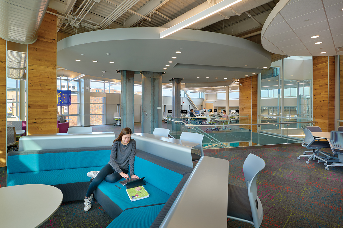 Student access to faculty is enhanced with office and administrative space for College of Engineering and College of Technology integrated into the building design. The intentionally transparent environment encourages views of project-building from circulation spaces and teaming areas, as well as visual connection to and from the “Student Success Corridor” (the nickname for street on which the building is located) creating a “see-and-be-seen” environment.