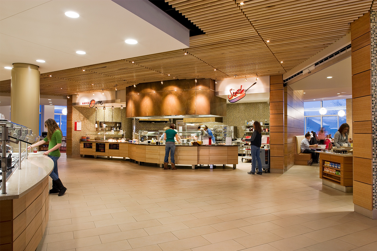 Located at the center crosswalk of campus, the Union was designed to be a “Main Street”. It features diverse elements including a cyber cafe, computer lab, lounges, book center, convenience store, student mail center, entertainment areas, student government, international and multicultural departments, career center and administrative and support offices. A key element in creating this social center was the consolidation of all campus dining into a single place with multiple venues, reinforcing interaction of students, faculty, and staff. It also houses a 500-seat ballroom and conference center.
