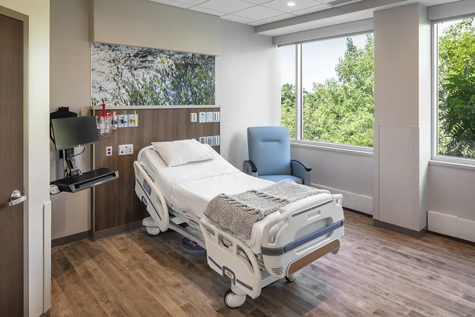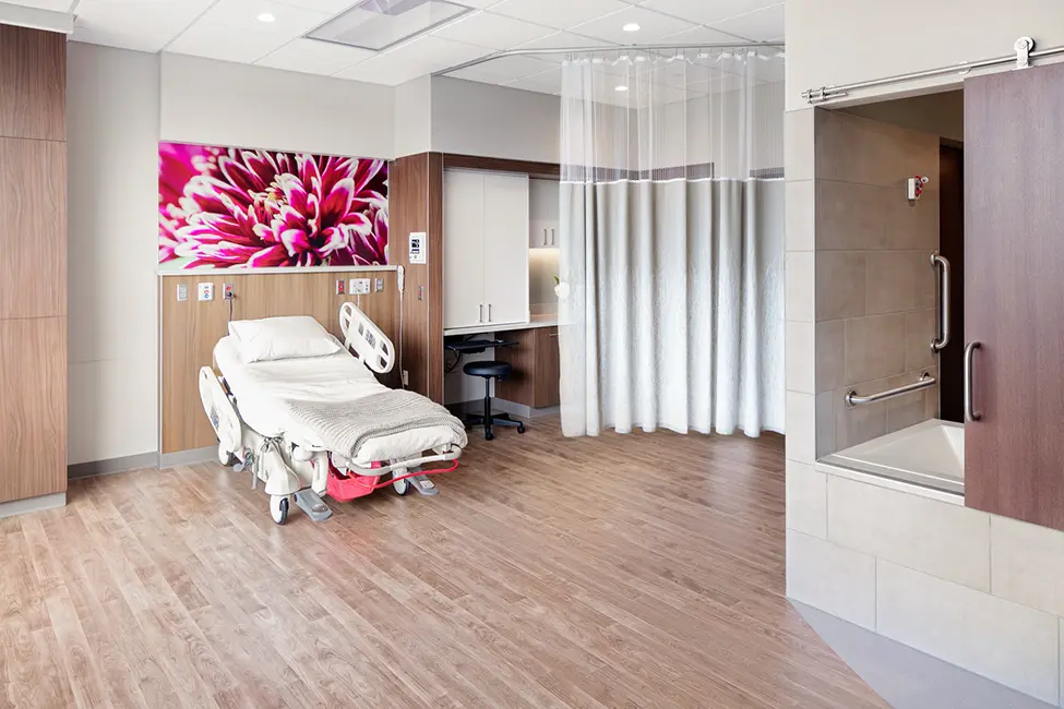 The design of the Family Birthing Unit has a strong focus on patient experience. The unit has abundant glazing, nature inspired graphics throughout and a thoughtfully planned headwall to conceal medical outlet and equipment when not in use. The labor/delivery/recovery/postpartum rooms also incorporate tubs near the patient beds to allow patients to labor in water, which can reduce the need for anesthetics. When the tub is not in use, a barn door separates the tub from the patient room.