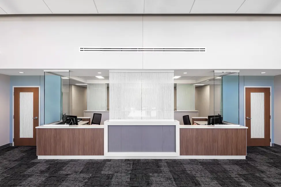 A new site was chosen off a busy state highway on the east side of town, increasing the clinic’s visibility and accessibility. The one-story, 6,800-square-foot facility has a contemporary design, with high sloped ceilings and lots of glass in the reception area to let in natural light. More windows in the hallways help patients and staff orient themselves in the building and offer views of nature that reduce stress levels. High-grade drywall in the walls and a white noise sound-masking system help add privacy for patients.