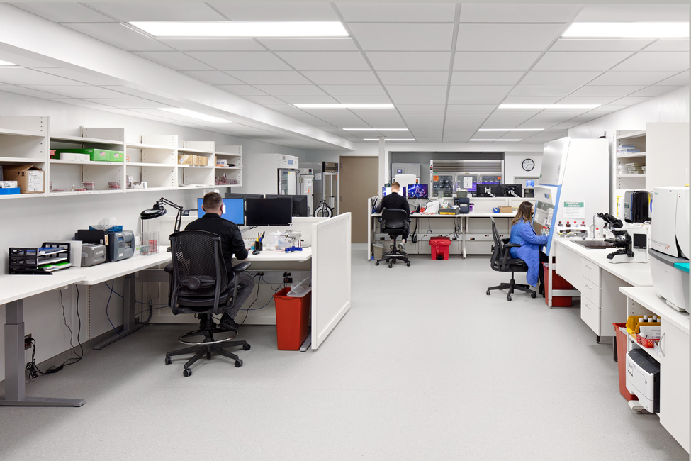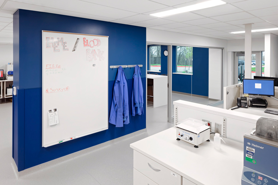 The lab space housed multiple disciplines – intake, microbiology, chemistry, hematology, and a blood bank – each with its own environmental and workflow needs. In addition to the need for further separation between testing areas, the space had other challenges including lack of storage and inefficiencies in heating, cooling, and staff workflow.
