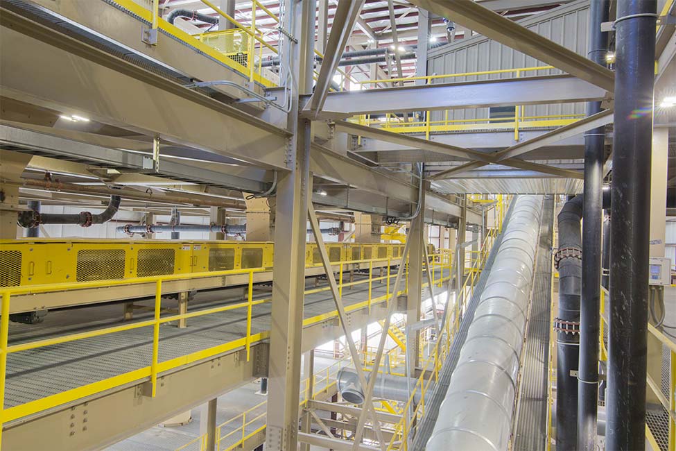Our design included equipment support and access platforms for dryers, conveyors, silos, cyclones, piping, vacuum pumps, accessories, hoist beams, MCC, hydrosizer equipment and accessories, and clarifier equipment. Shive-Hattery provided foundation design for a PEMB, as well as design for a storm shelter located within the warehouse footprint. Machine load allowance was used in the design of the primary steel frame and lateral support to allow for future bridge cranes and hoists.