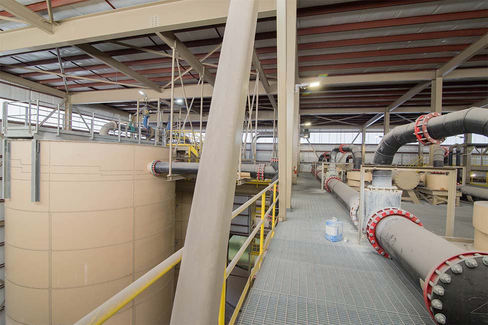 The building foundations needed to account for dust collectors, fans, stacks, a 3,000 ton silo, and site exterior conveyors. Primary steel structures includes support for load-out equipment and surge bin for three rail load-out structures. We provided framing for the building structures including the filterbelt building, slurry silo link, hydrosizer building, and damp material/dryer building.