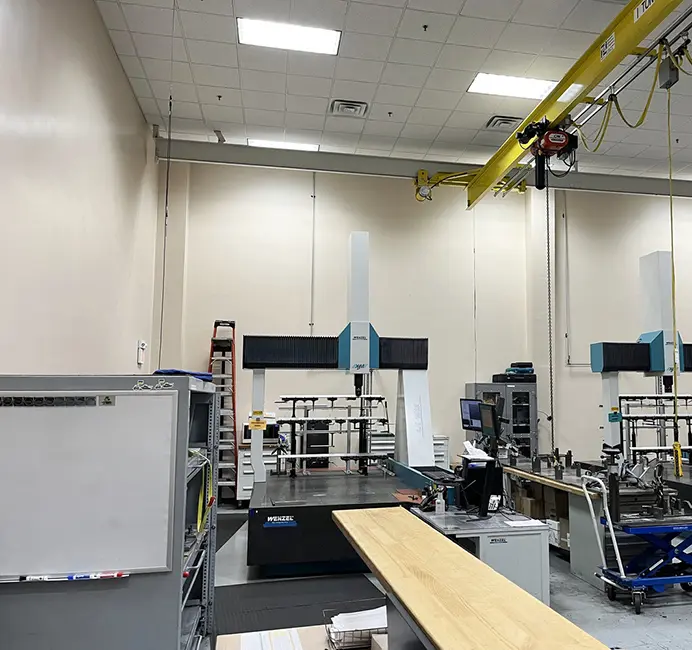 The CMM Room had two 7.5-ton overhead bridge cranes to move parts within the spaces. The structure supporting the bridge cranes required a special foundation system designed and installed on the existing floor.