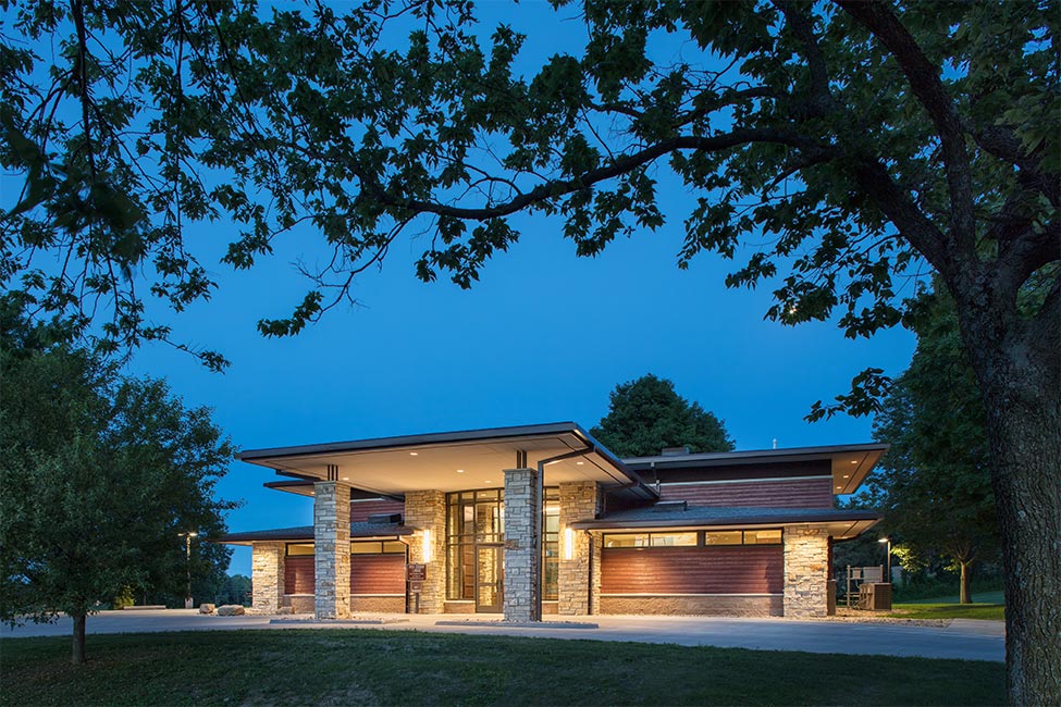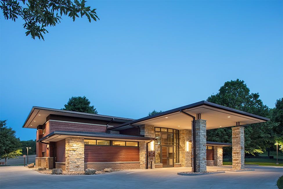 After analyzing what was required by current codes and the improvements wanted by Linn County Conservation, the design team found that a renovation would not leave much of the old building and would cost about the same as constructing a new building. It was decided to tear down the lodge and build a new one in the same location.