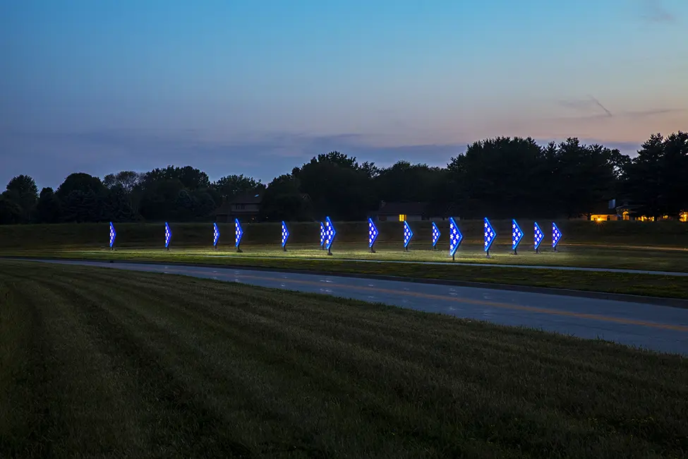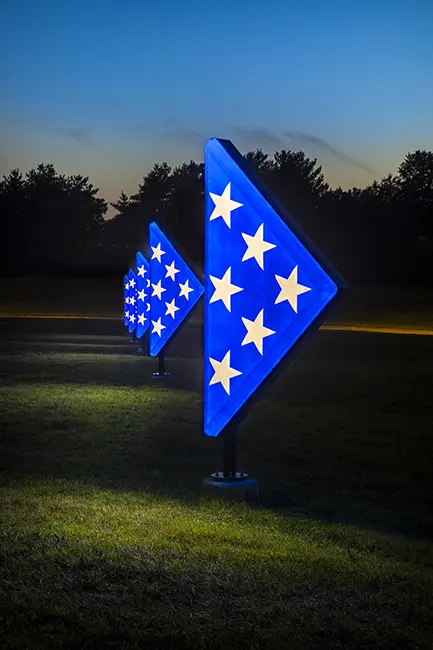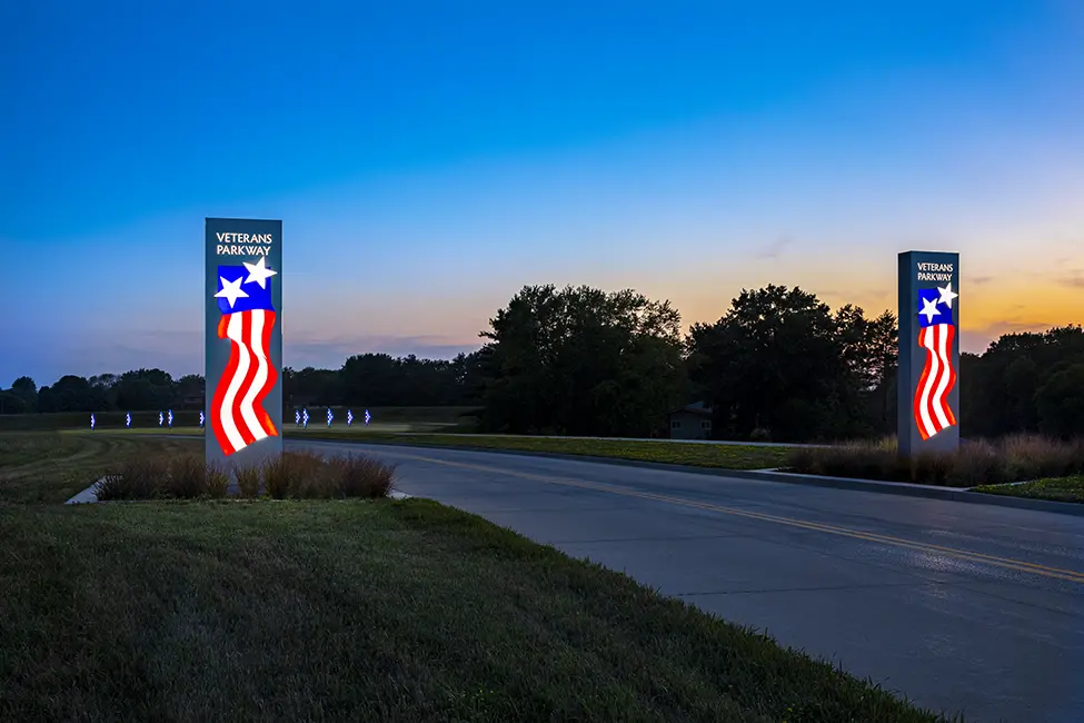 The City of West Des Moines, Iowa honored veterans with its Folded Flags art installation. Unveiled on Flag Day 2019, the 15-foot illuminating folded flags marks the first phase of an 11-mile roadway enhancement project beginning at Brown’s Woods Drive and Veterans Parkway. With Folded Flags, reflection is the main theme and serves as a reminder of our veterans’ service and sacrifice.