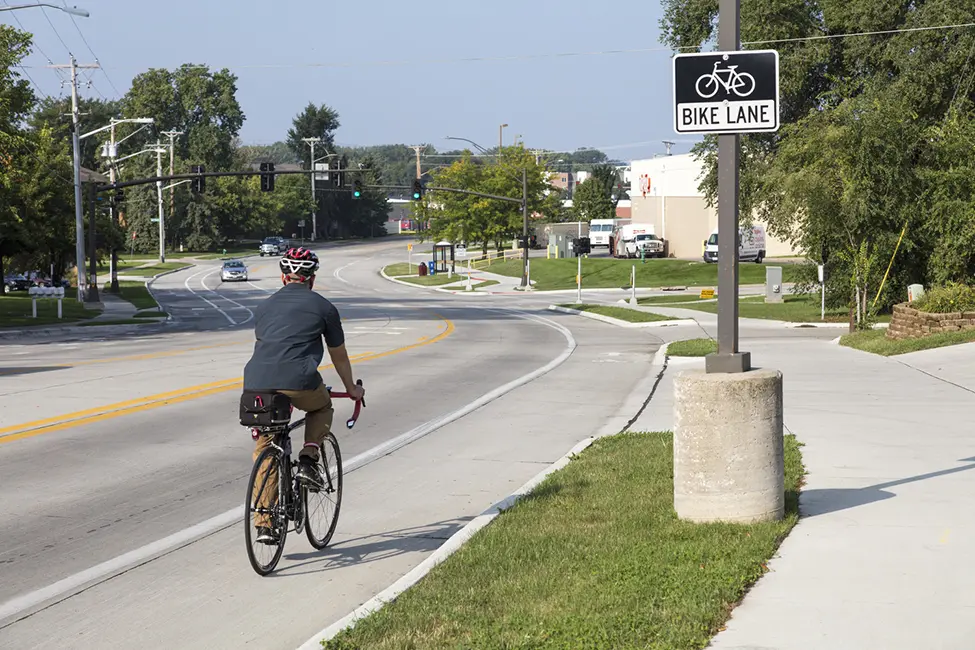 Road Diet — The acquisition of right-of-way proved especially difficult for the project budget and schedule due to the constrained nature of the existing corridor. Shive-Hattery completed a study of both the traffic and the appropriate bicycle facilities recommending a four-lane to three-lane conversion including a two-way left turn lane and on-street bike lanes.