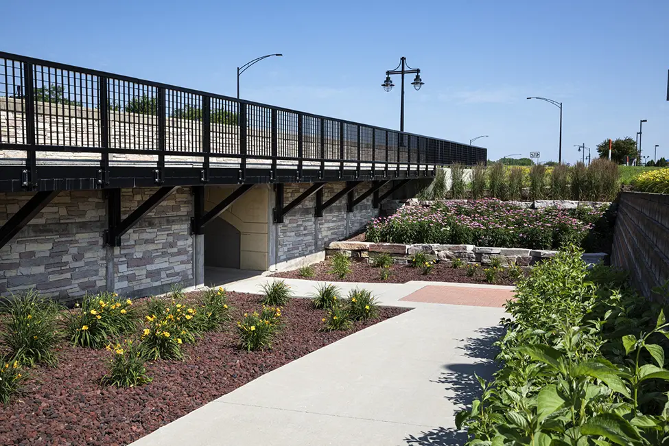 Shive-Hattery prepared conceptual and functional plans for discussion with city staff, city council, utility companies, adjacent property owners, and stakeholders. To communicate the project to the public, Shive-Hattery prepared a video the City used on their website and media outlets to show the completed project. A five-lane roadway section was designed including new trails, sidewalks, LED street and pedestrian lights with decorative banners, artistic LED lighted bridge panels, and new landscaping. Stormwater quality improvement biocells were also utilized to provide clean water effluent.
