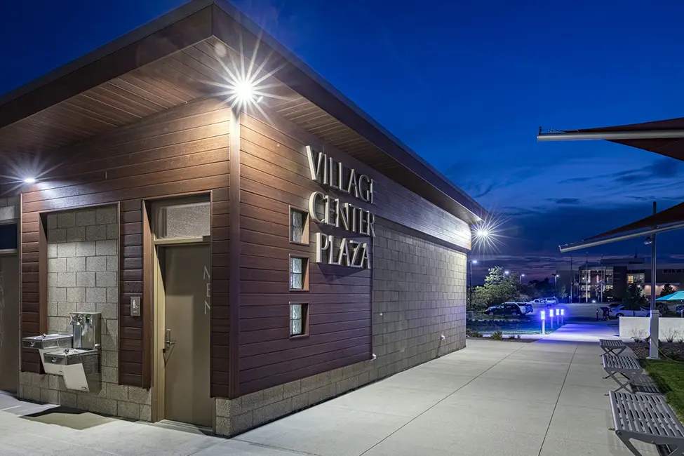 A walking path from the seating area to a small building with restrooms and drinking fountains is flanked by fountains shooting water up two feet and tall light poles that can change color to match event themes. For extra lighting, smaller lighted bollards were placed along the seating walls. Underground receptacles are available for food trucks and bands, with additional receptacles throughout the seat walls for pedestrians to plug into.