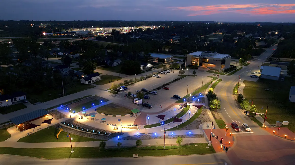 The Hiawatha Plaza’s adaptability makes it appealing as a rest stop for daily pedestrians along the Cedar Valley Nature Trail as well as a community gathering space for large planned events like concerts. With future planning for residential and mixed-use retail in the other three quadrants of the intersection, the Plaza’s usefulness will only increase.
