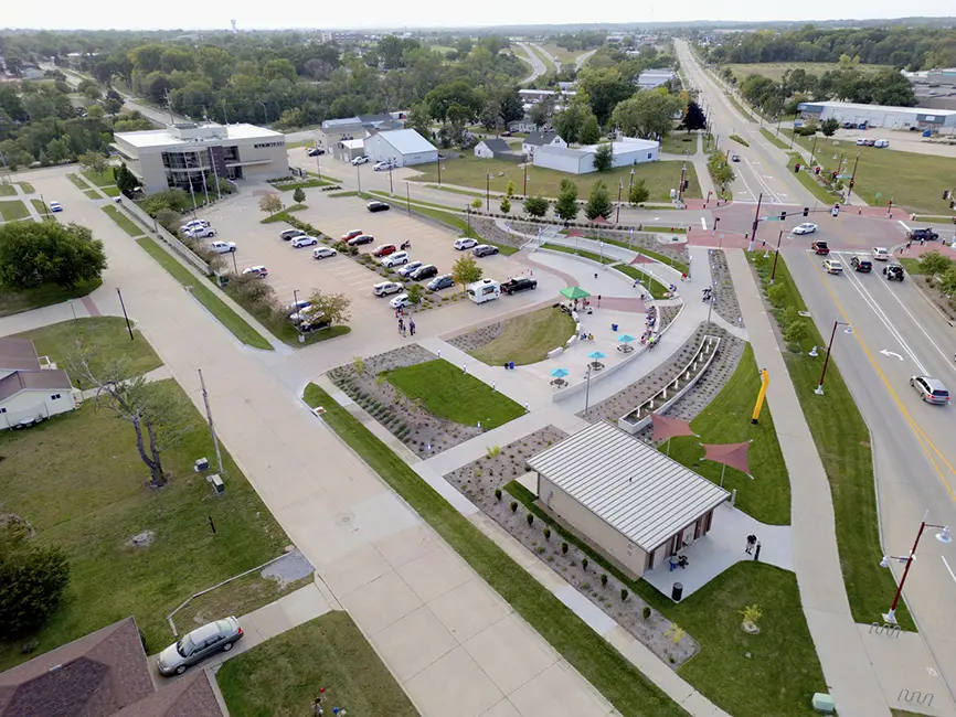 After the reconstruction of the Center Point Road/Emmons Road/Robin Road intersection that made it more pedestrian-friendly, the City of Hiawatha saw an opportunity to make the area – located in the heart of the City – a community gathering space. In the southwest corner of the intersection, a triangle-shaped section of grassland between City Hall and Center Point Road could be converted into a seating plaza for not only daily use along the Cedar Valley Nature Trail but also to host large community events like concerts. The project would need to contend with steep slopes from the parking lot to street level.