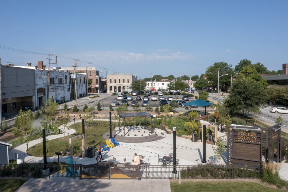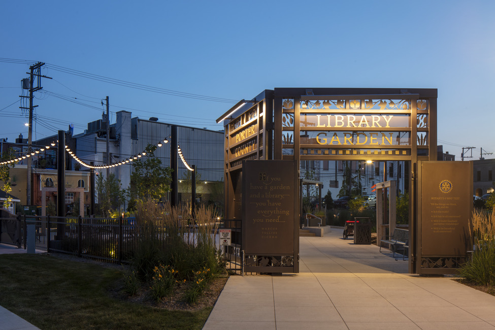 The Porter County Library in Valparaiso, Ind., purchased property across the street with the desire to transform it into a green space where they could host events and children’s activities. With many special amenities throughout the garden, including a performance stage, the client wanted a unique gateway feature that would tie together the library theme and make the garden stand out to passersby.