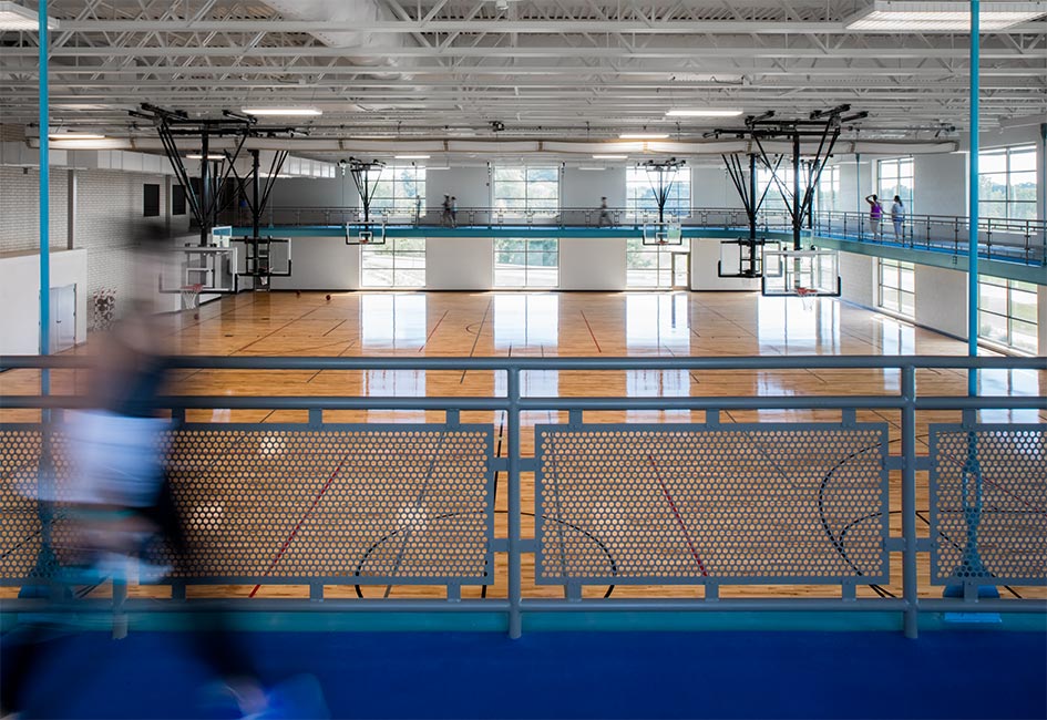 The new addition was built on the south side of the existing building. This portion includes two full-size basketball courts complete with a divider curtain and retractable cross-court goals. Natural light and views are provided through 2-story glass curtain walls that also include shading devices to prevent unwanted glare; this openness benefits players and runners alike.