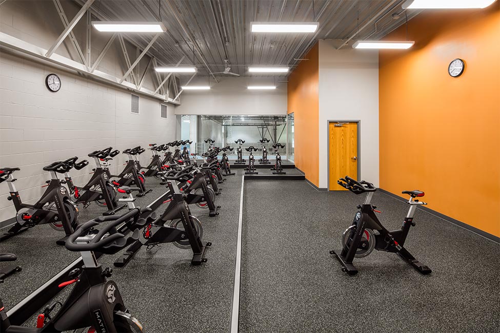 The open exercise space on the mezzanine was divided and enclosed to create a yoga studio and spin class room. The existing 1/16-mile running track at the mezzanine level was tied directly to the new suspended running track, doubling its length to 1/8-mile around the new gymnasium.